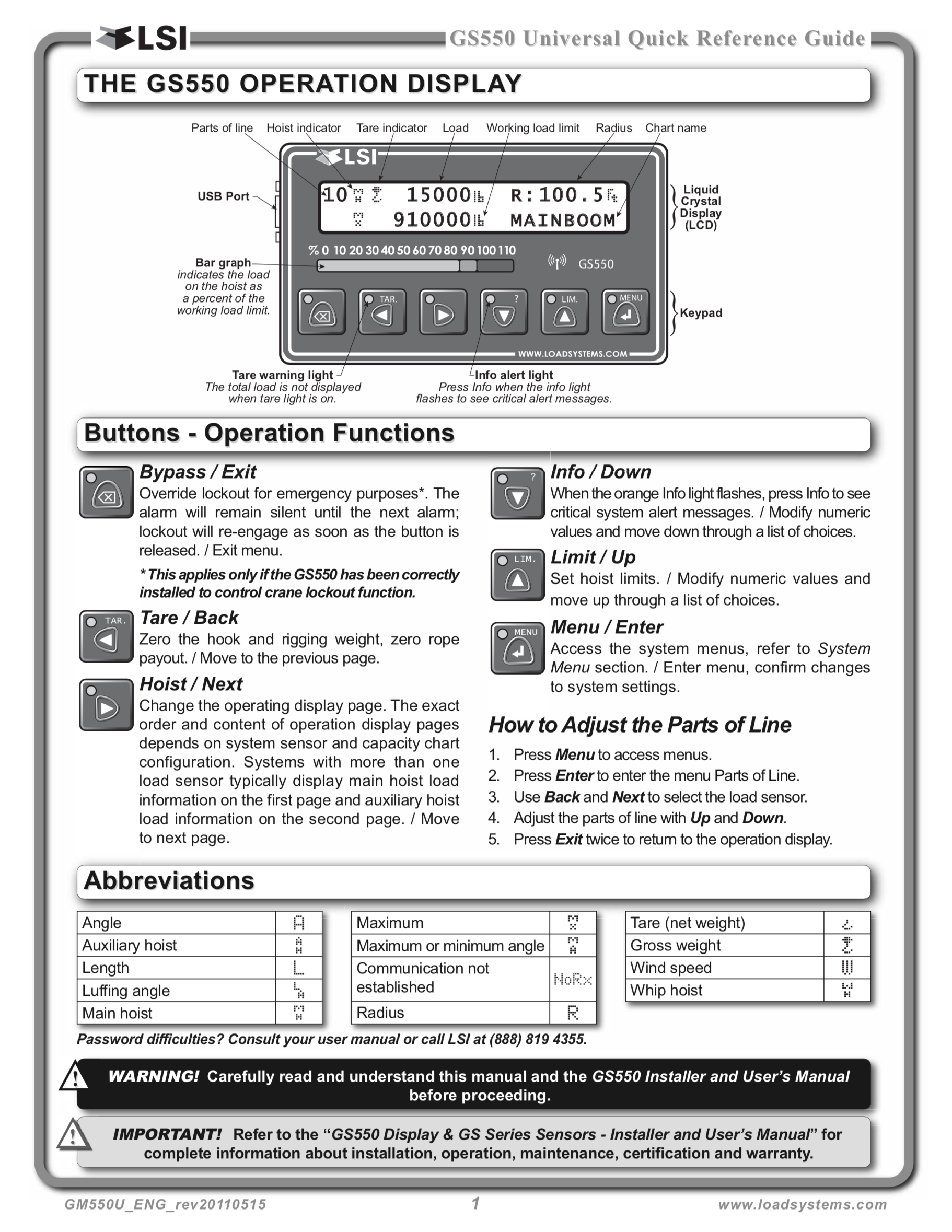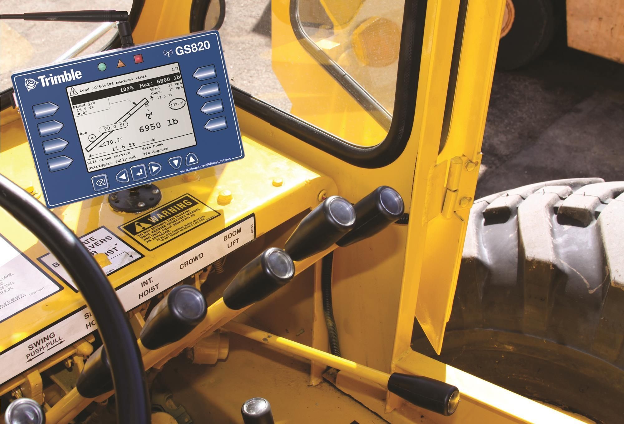 settingsThe Trimble GS 550 system includes the cabin mounted GS550 radio display and compatible crane mounted GS and GC series sensors. The GS550 display creates a two-way radio network with the sensors to bring required lift data to the operator. Hoist load, boom and jib angles, boom length, wind speed and pending two-block can be detected and then indicated to the operator in real time. Working load radius can be calculated and compared to a rated capacity chart (if programmed). Furthermore the GS550 can be programmed to generate warnings, alarms and lockout commands, all triggered by adjustable thresholds and limits. All these events can be recorded by the data logger with a time and date stamp. The exact operational function of the GS 550 system depends on the sensor configuration used and the rated capacity charts programmed (where applicable). The Trimble GS550 includes a USB port to facilitate software and chart updates and data logger downloads using a USB mass storage device (USB key)